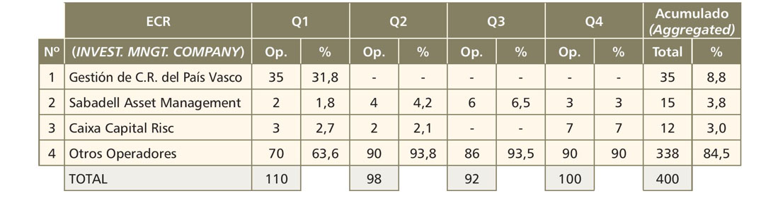 En relación con el número de operaciones de inversión, el acumulado del año asciende a 787 operaciones las cuales se distribuyen, atendiendo a la fase de inversión, en 400 (50,8%) inversiones de seed & venture capital, 164 (20,8%) operaciones de private equity (11,7% ) inversiones de capital riesgo inmobiliario y 52 (6,6%) operaciones en situaciones especiales. Adicionalmente se han registrado 79 (10%) operaciones de equity crowdfunding.